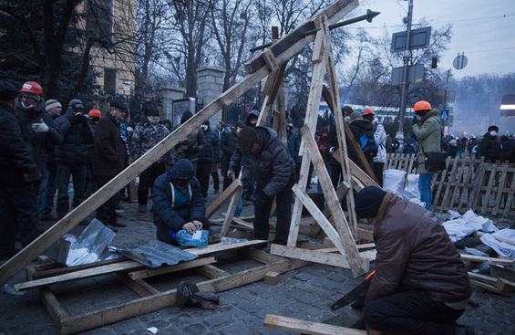 Революция в Киеве уже не пахнет безобидным костром. Теперь она жжет глаза, оглушает до беспамятства. И в воздухе — запах серы. Но Майдан все еще сопротивляется радикализации. С бойней на Грушевского он вообще существует будто в параллельных плоскостях. Хотя расстояние между ними — 300 метров и полторы минуты ходьбы быстрым шагом. Здесь все так же разносят чай и бутерброды, со сцены поют «Червону руту», а кто-то пританцовывает, и кругом застоявшийся запах костра. Но стоит отойти немного за баррикады, как туманом в воздухе возникает эта сера. И там, где дышать становится совсем нелегко, людей еще больше. Навстречу, прихрамывая, идут трое парней в касках с дубинками. Разодранные куртки, розовые щеки, совсем молодые лица, на шеях висят респираторы. «Перекурим и назад», — говорит кто-то из них. В общем, на Майдан теперь идут только за едой и погреться, возвращаясь затем на Грушевского.