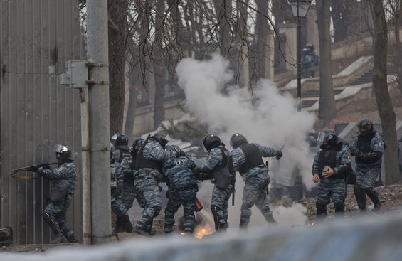 В понедельник ранение в лицо получил и наш коллега, оператор из ICCTV Роман Малко. С угрозой потери глаза его доставили в Александровскую больницу Киева. Малко рассказывает, что в лицо ему резиновой пулей выстрелил спецназовец. Официальные заявления милиции о том, что это случайность, а журналистам гарантирована безопасность, вызывают нервный смех. Но нервно смеяться можно было только до вечера понедельника, когда стало известно, что «резинкой» целились в голову оператору украинского «5 канала» — но попали в камеру. Позже светошумовая граната прилетела в ноги репортеру РЕН ТВ Станиславу Григорьеву, наговаривавшему в камеру репортаж, — у него перелом. Лицемерие спикеров МВД после этого можно прочитывать лишь так: журналистам гарантированы прицельные травмы, человек в жилете «Пресса» — особая мишень. В понедельник ночью на Грушевского резиновыми пулями два раза попало и по мне. Небольшие твердые шарики оставляют синяки на ногах, но гораздо слабее чувствуются через два свитера и куртку.