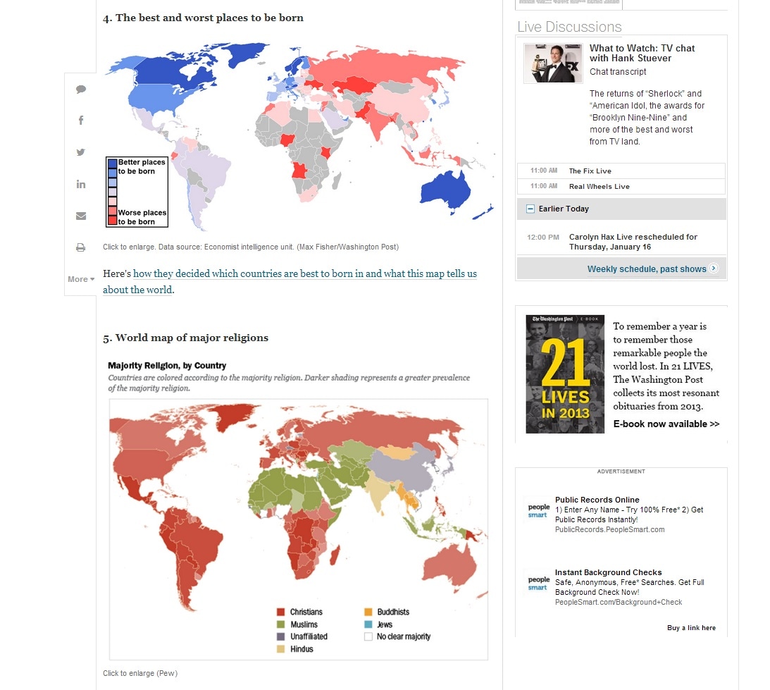 Блоггер Макс Фишер (Max Fisher), автор газеты Washington Post опубликовал сделанную им подборку из самых интересных и показательных карт, объясняющих историю мира: где живут 30 миллионов рабов; какие регионы богаты на нобелевских лауреатов; жители каких стран чувствуют себя счастливее остальных; как выглядел мир, когда в нем властвовали Испания и Португалия, – всего 40 карт различной тематики и объема визуализированных данных.