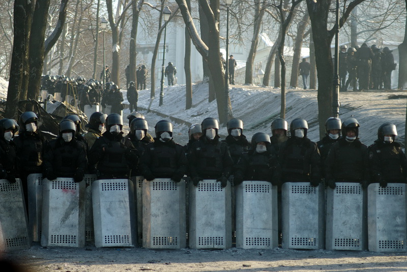 Линия фронта на этой фешенебельной улице несколько раз за последние дни смещалась в ту или иную сторону, но в итоге осталась на том же месте – около входа в парк перед стадионом "Динамо". У позиции "Беркута", защищающего правительственный квартал, есть и плюсы, и минусы. Плюс в том, что "Беркут" – выше и стоит на горке, а с горки гнать людей легче, что милиция и продемонстрировала в среду, прогнав в какой-то момент митингующих вниз до самой Европейской площади.