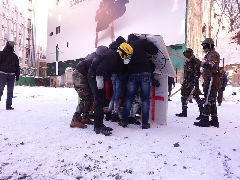 Дымятся под ногами корды сгоревших покрышек, в соседнем дворе – тренировка: группа молодых людей под руководством более опытных, хотя и явно более молодых товарищей оттачивает передвижение "черепахи" – группы из 5-6 человек, укрывающихся фанерными щитами. Два шага вперед, еще два, тренеры тычут палками в щели между щитами, имитируя действуя "Беркута", залп камнями в сторону пустыря, два шага назад.