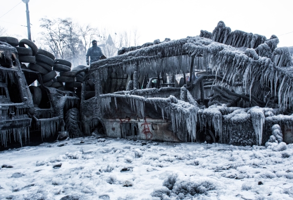 Я иду на передовую. Здесь о том, что особыми успехами переговоры не увенчались, пока не знают. Люди греются вокруг горящих бочек, на трехметровых баррикадах кое-где виднеются силуэты, высматривающие «Беркут» где-то там, выше по улице Грушевского. От полыхавшего здесь пожарища окрестные дома и колоннада стадиона «Динамо» покрылись копотью. Снег черный, то тут, то там попадается битое стекло от коктейлей Молотова.