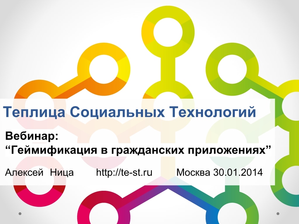 30 января, в 14-00 2014 года по московскому времени, пройдет вебинар «Геймификация в гражданскихприложениях». Вебинар проведет Алексей Ница, автор портала «Теплица социальных технологий», энтузиаст онлайн-образования, геймификации и эффективного потребления и использования информации.