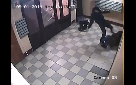 Далее другая камера запечатлела произошедшее в подъезде: крепкий молодой мужчина бьет женщин руками и ногами в грудь и в живот. Когда одна из жертв пытается подняться, грабитель ее, уже лежащую, со всей силы пинает ногой по голове. Затем отнимает у одной из пенсионерок сумочку и убегает. Сообщники удаляются вместе с ним.
