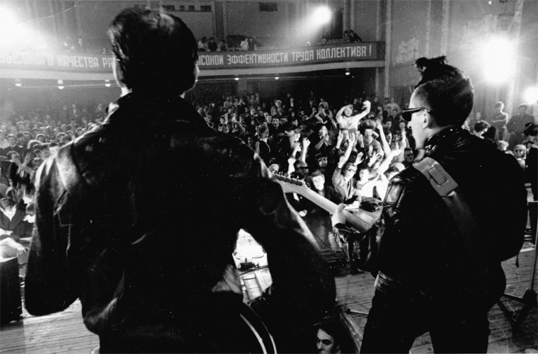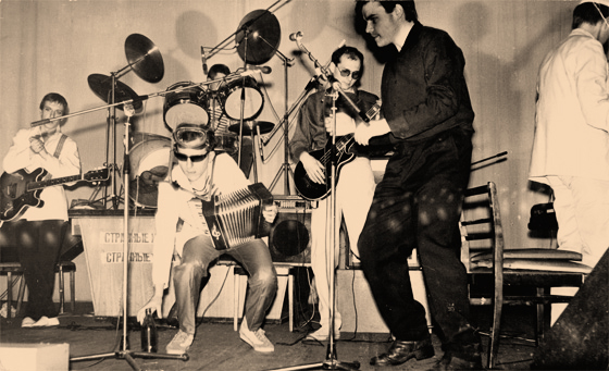 Виктор: Что значит «убрали»? Мы сыграли другую музыку — отличающуюся от тяжелого рока и рок-н-ролла, который было принято тогда играть. Представьте себе выступление в небольшом помещении — танцевальном классе при Доме культуры, переоборудованном под зал. Там была очень невысокая сцена — 30 сантиметров от пола. Зал арендовался под сессии клуба «Круг», альтернативного джазовому клубу «Квадрат», — оба этих клуба организовал Алик Кан, который сейчас на BBC работает. По четвергам там заседал клуб аквалангистов, а по субботам там устраивали полулегальные рок-концерты — «Аквариум», Курехин там играл, мы… Не каждую неделю даже — где-то раз в месяц. Ни о каких перформансах там думать не приходилось. Это был один из первых наших концертов. Но при этом мы были не мальчики уже — до этого мы играли на полузакрытых квартирниках. Играли вместе с 1979-го.