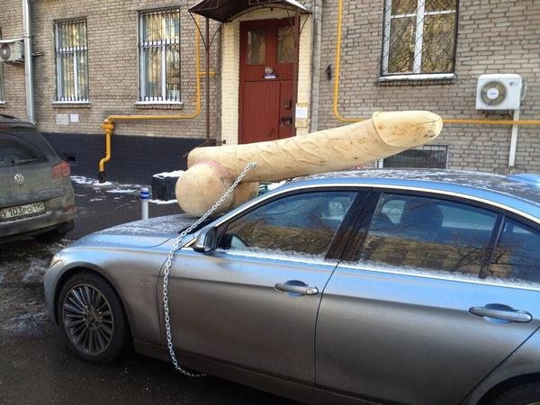 Неизвестные акционисты на стальную цепь прикрепили деревянный мужской член к капоту автомобиля блогера Арсения Бобровского, более известного как KermlinRussia. Об этом Бобровский сообщил в своем твиттере.