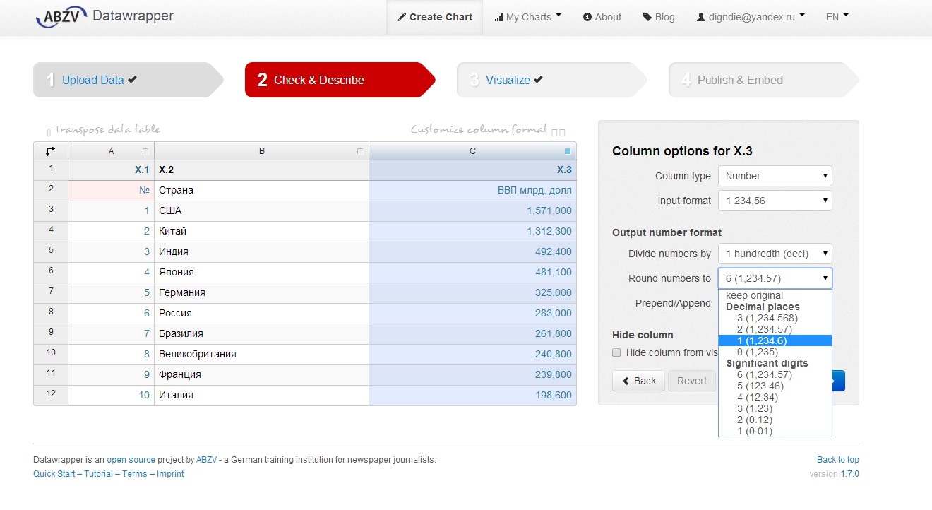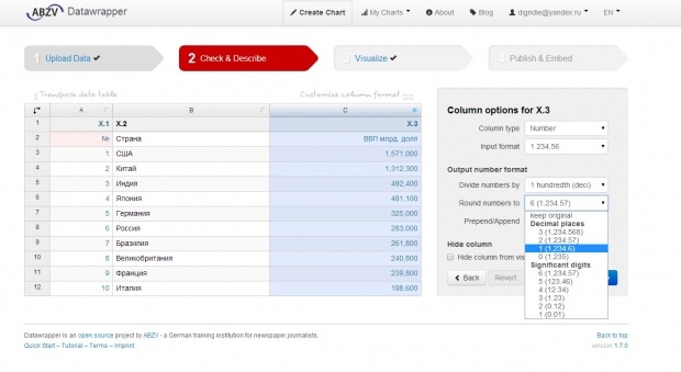 Нажав кнопку «Upload and Continue», вы переходите к подготовке данных перед построением графика. На этом этапе вы можете указать, в каком виде будут представлены данные — в таблицах или строках, скрыть отдельные столбцы, указать числовой формат отображения данных , округлить числа до нужного значения и указать ссылку на источник, откуда были взяты данные.