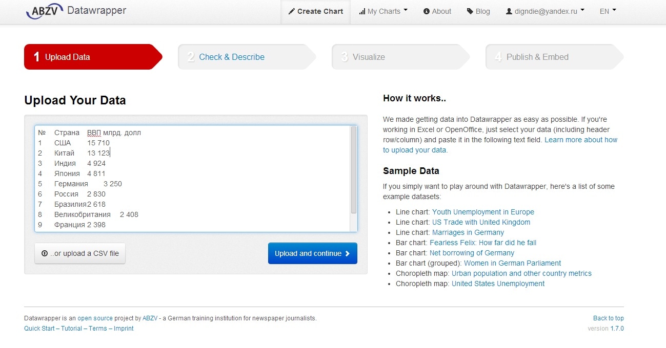 Загрузка данных в «Datawrapper» осуществляется двумя способами. Вы можете просто обвести значения в Excel, скопировать их и вставить в окошко программы или загрузить CSV файл с вашими данными.