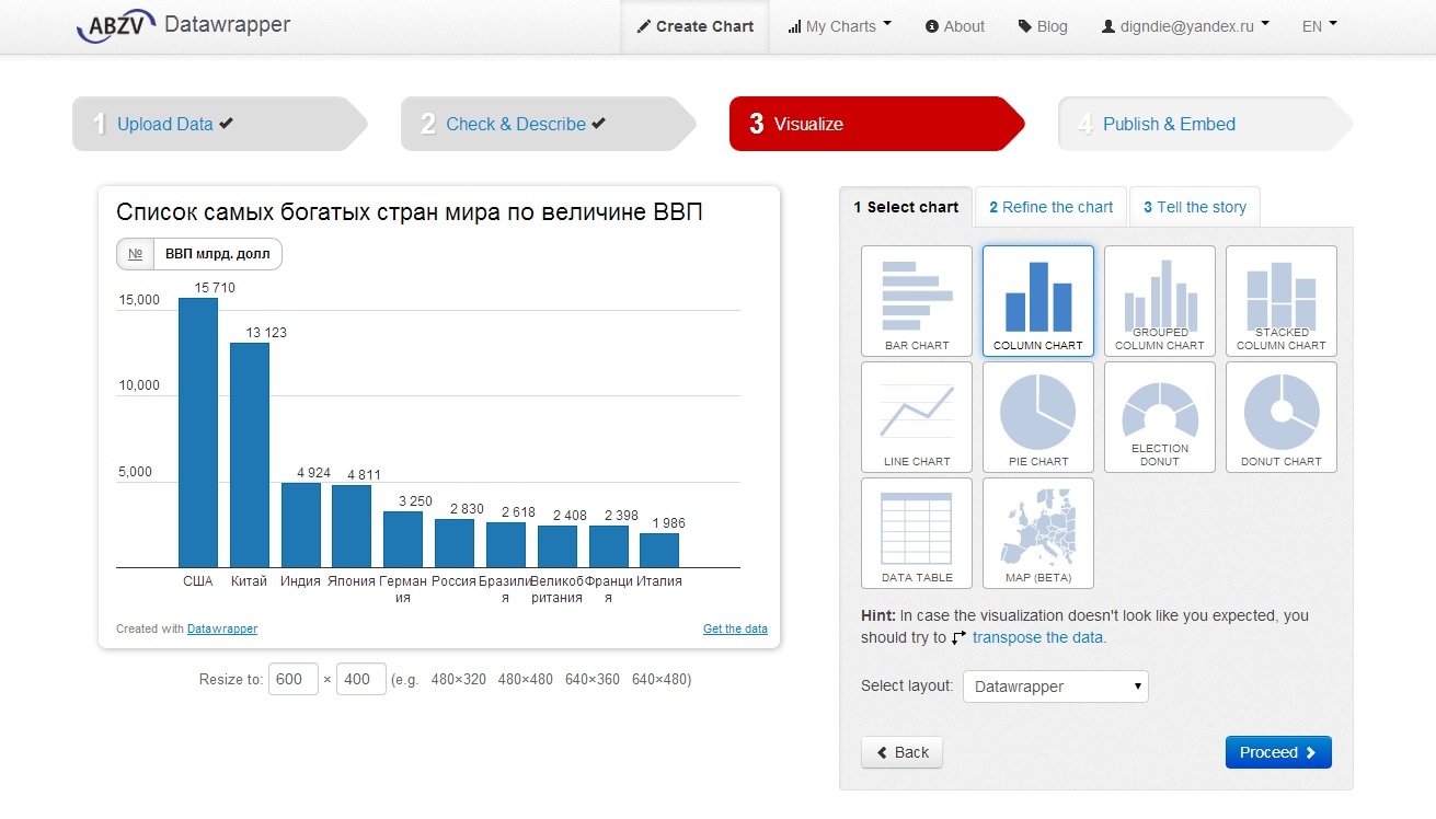Нажав копку «Visualize», вы перейдете к предпоследнему и основу этапу в построении графика, именно здесь раскрываются главные возможности инструмента. На ваш выбор несколько видов графиков, между которыми можно свободно переключаться — график будет меняться прямо на ваших глазах.