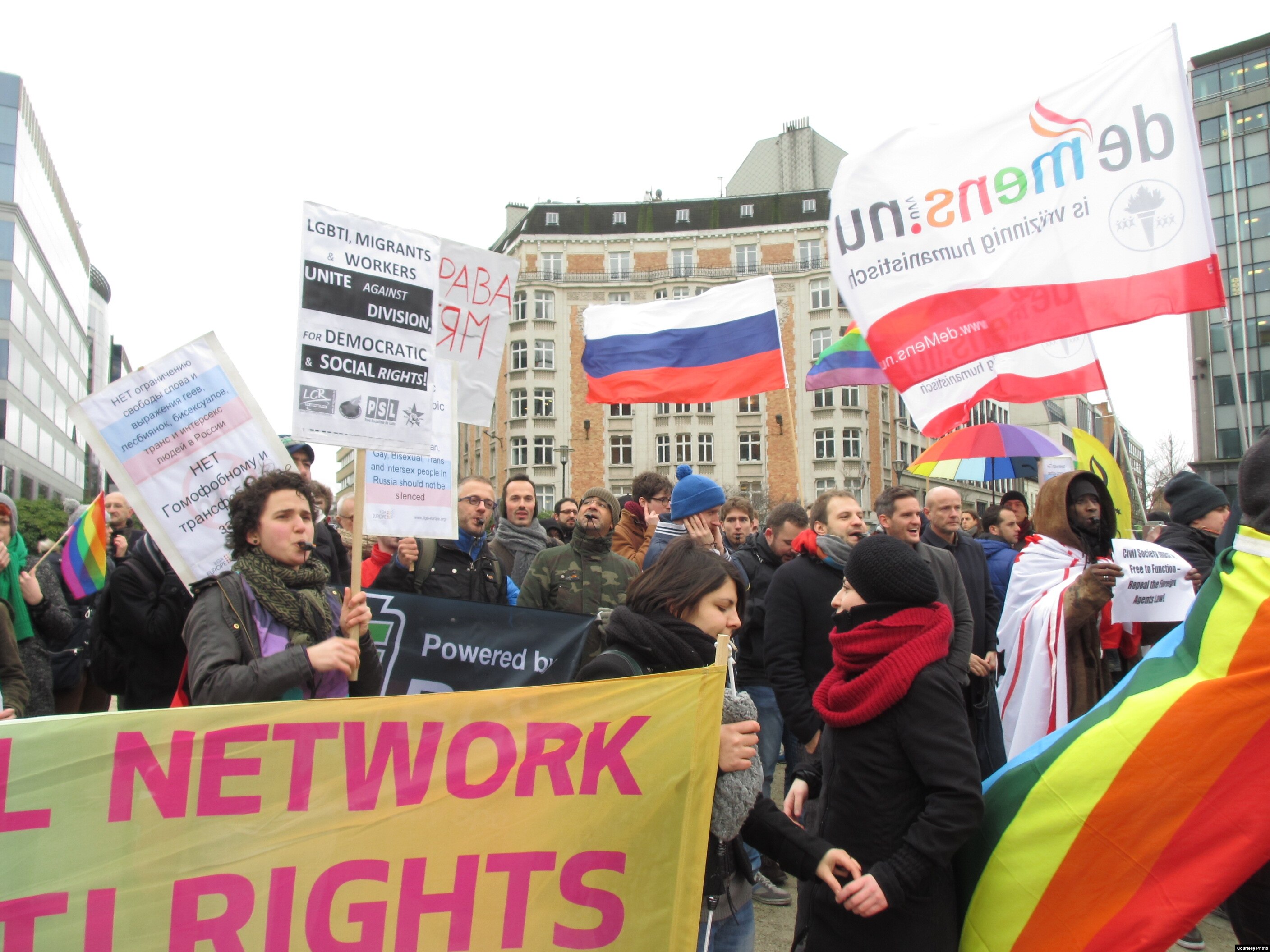 Координатор проектов организации "Международное партнерство за права человека" Симон Папуашвили рассказал, что это попытка привлечь внимание и российского правительства, и органов ЕС к тому, что происходит в России, в том числе к давлению, которому подвергается гражданское общество. В акции приняли участие такие организации, как Amnesty International, Human Rights Watch, представитель российской организации "Гражданский вердикт" Наталья Таубина.