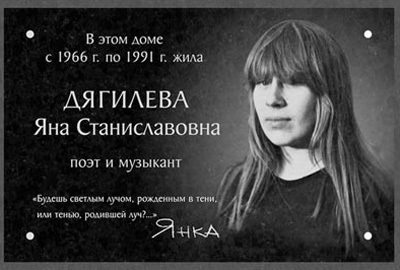 На доске будет размещена фотография Янки Дягилевой и надпись «В этом доме жила поэт и музыкант Яна Станиславовна Дягилева (1966–1991). Будешь светлым лучом, рожденным в тени, или тенью, родившей луч?..».