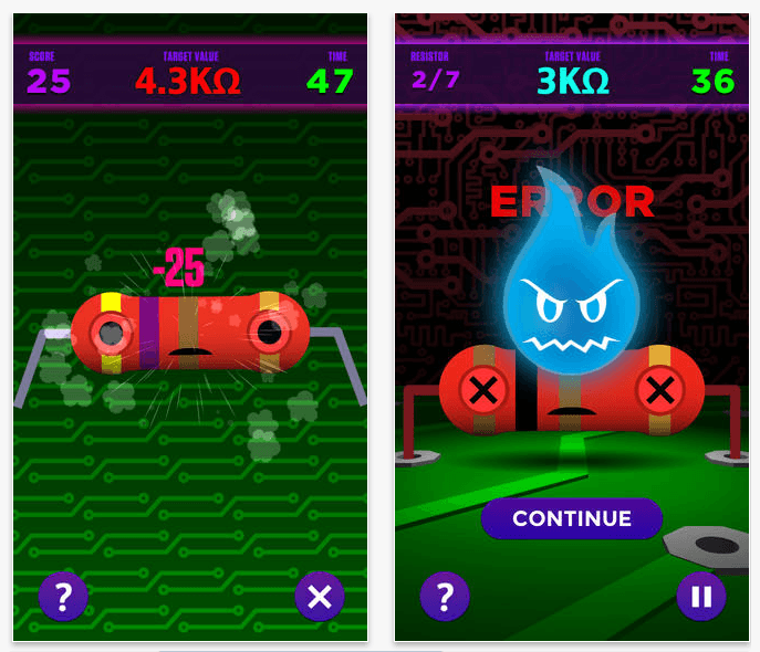 Быстро разобраться и запомнить его бывает непросто, особенно самым юным любителям физики. Именно для них и было создано приложение «Mho’s Resistance», которое в игровой форме учит пользователей различать цветовые коды. Игроку предстоит устанавливать правильную последовательность шифра и находить ошибки в цветовой цепочке резистора, будьте осторожны − каждый неправильный ответ вызывает синего монстра.