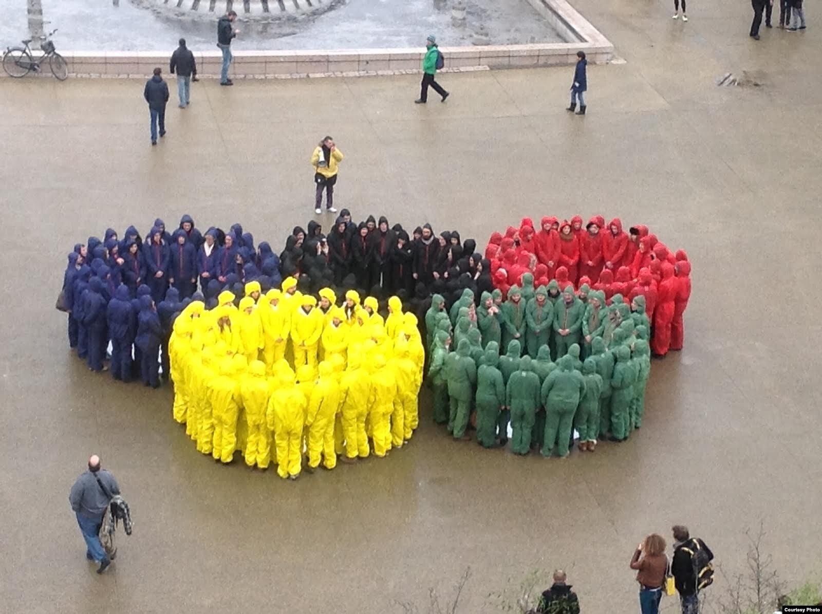 Около полудня участники протестной акции, взявшись за руки, образовали фигуру в виде олимпийских колец. Внутри колец были представлены плакаты с фотографиями российских политзаключенных и снимками, сделанными на акциях российской оппозиции, разогнанных полицией. Организаторы митинга в громкоговорители рассказывали об ограничениях свободы слова в России, о дискриминации сексуальных меньшинств, об эксплуатации мигрантов и применении пыток в российских тюрьмах.