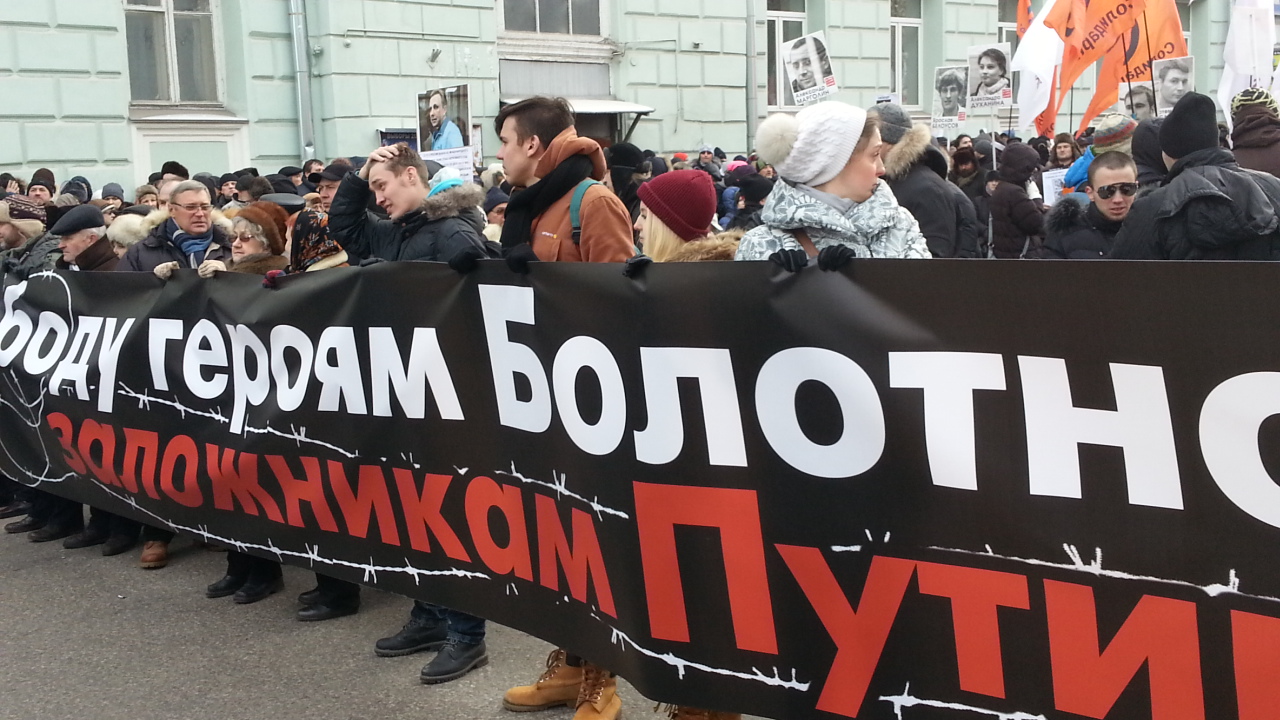 Лозунг шествия "Свободу узникам 6 мая!" поддерживался баннером: "Узникам свободу, олимпийских воров на хлеб и воду!"