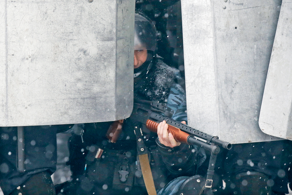 По утверждению украинского МВД, у милиционеров и солдат в Киеве нет летального оружия. Боец «Беркута», Киев, 22 января 2014 г.