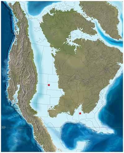 Палеокарта Северной Америки 85 млн лет назад. Звездочками отмечены современные Южная Дакота и Алабама, где были найдены ископаемые аммониты Обычно исследователи определяли температуру океана по изотопам кислорода, сохраняющимся в ископаемых раковинах. Но на многих местах раскопок раковины аммонитов не сохранились, что заставило ученых сконцентрировать свое внимание на челюстях этих вымерших головоногих. Оказывается, челюсти хорошо сохраняются даже в тех случаях, когда от раковин не остается и следа.