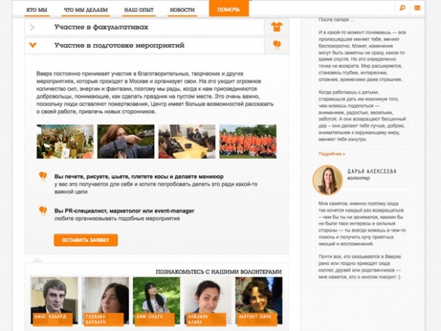 - специальный раздел или страница «для волонтеров» − в этом случае необходимо, чтобы такой раздел было легко найти и получить к нему доступ с любой страницы сайта (а не только с главной). В нем обычно размещают более подробное описание видов волонтерской занятости в вашей организации, контактную информацию, а также различные анкеты, регистрационные формы и опросы, позволяющие организации получить информацию о потенциальном волонтере (о формах на сайте см. руководство Эффективный сайт некоммерческой организации. Контактная форма своими руками);