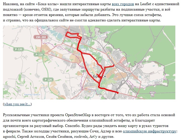 Однако зачастую организаторы не предоставляют полной информации о маршруте передвижения огня, оставляя граждан в неведении. В этом году на помощь пользователям пришли участники проекта OpenStreetMap. Они внесли вклад в картографическое обеспечение олимпийской эстафеты. Созданные при их участии карты использовались на всех официальных сайтах городов, где проходил маршрут олимпийского огня .