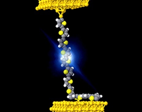 Для своего светодиода ученые использовали нитевидную молекулу полимера под названием политиофен. Это хороший электрический проводник, состоит из водорода, углерода и серы, широко применяется при создании светодиодов стандартного размера, уже имеющихся на рынке. В эксперименте один конец политиофеновой молекулы был подсоединен к щупу сканирующего туннельного микроскопа, другой – к золотому электроду. Когда через молекулу пропустили ток нужного направления, она стала излучать свет.
