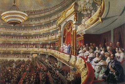 Михаил Зичи. Гала-представление в Большом театре по случаю коронации Александра II и императрицы Марии Александровны. 1856 Большой театр намерен демонтировать 247 неудобных мест и сделать их стоячими. Со следующего сезона на эти места будут продаваться входные билеты по 100 рублей.