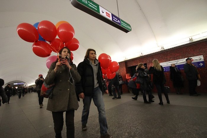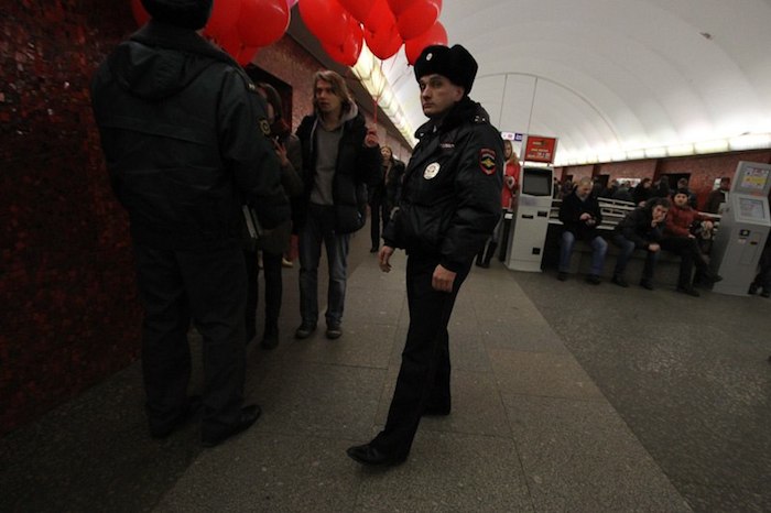 Сегодня ЛГБТ-активисты попытались провести акцию протеста, приуроченную к Олимпийским играм в Сочи, и выпустить на одной из станций метро разноцветные воздушные шары. Около 19 часов двое молодых людей спустились в метро на станции «Маяковская», у каждого из них было несколько десятков шариков. На перроне сотрудники полиции попросили активистов покинуть станцию, мотивируя это тем, что воздушные шары могут забиться в вентиляцию.
