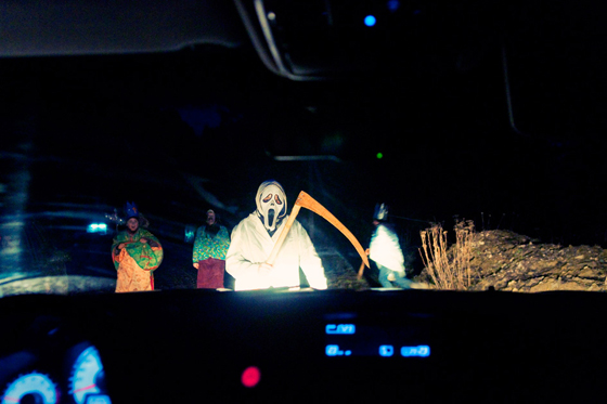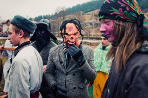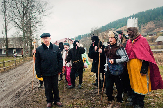 — Нет, так нельзя говорить, — отвечает он. — В восьмидесятых годах при Советах жизнь была хорошая. Только нам главное не нравилось — угнетение религии, — пан загибает один палец, — мовы… — второй. Но пан не успевает договорить и загнуть следующий палец — из темноты показывается смерть с длинным белым лицом и с косой в руках. За ней семенит черт с бубенцами на поясе. А за ними тянутся прочие ряженые, напевая колядки.