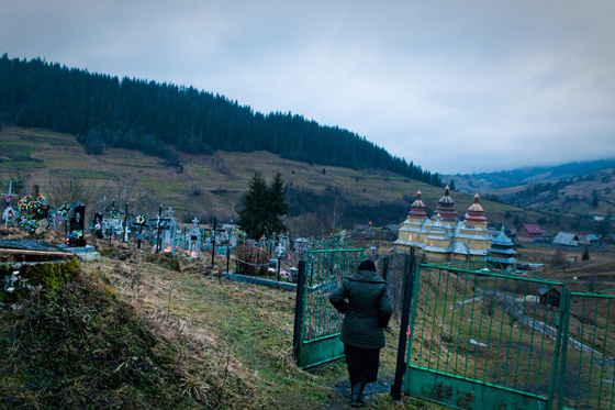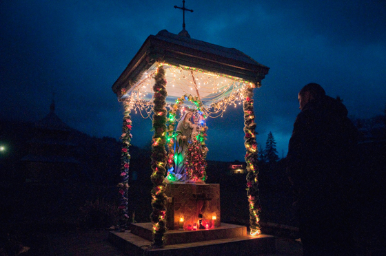 Снаружи у ворот церкви тяжело колышутся на предрассветном ветру полотнища — желто-голубой украинский и черно-красный флаги УПА. А первой прихожан из темноты встречает белая статуя Девы Марии, увитая играющими гирляндами. За спиной ее — через забор, через слякотную дорогу, через пригорок — кладбище. Вчера ночью на его могилах зажгли светильники — красные, желтые, синие. Отсюда они хорошо видны. Постояв напротив Богородицы, коротко помолившись, а может, попросив о чем-то — ведь в Святки, говорят, желания сбываются, — молчаливые мужчины и женщины, опоздавшие к началу службы, подходят к главному церковному входу.