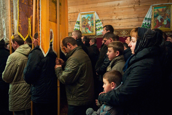 В церкви много расшитых хоругвей, яркие рушники мягко убирают иконы и словно развешены тут именно для того, чтобы принявший благодать мог вытереть ими свое мокрое лицо. Пол устилают домотканые дорожки. Половицы проседают под ногой. Церковь ветшает — это заметно.