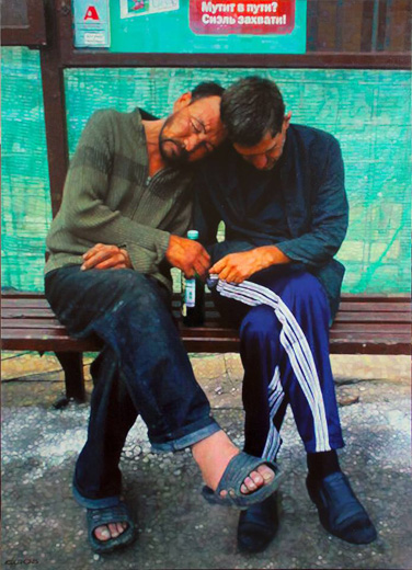 © Семен Файбисович / Коллекция Музея современного искусства в Бирмингеме Мутит в пути? 2008 г. Но ведь мир вокруг нас постоянно и стремительно меняется не только по этому вектору, и усилия отобразить эти разного рода перемены уже сами по себе чреваты инновативными результатами. А ведь эти усилия и есть главный, ключевой признак реалистического взгляда и подхода, неотторжимая суть которого — разговор именно со своим временем. Жизнь прошлым, эксплуатация на полном серьезе и пафосе разных «исторических», тем более архаических форм высказывания, восприятие мира через призмы разного рода неотрефлексированного ностальгирования — все это ну никак, ни разу не реализм. Равно как вообще «жизнеподобные» кич и салон, что озабочены не проблемами осмысления, прочувствования современного мира, а желанием угодить вкусу потенциального покупателя, как правило, культурно не ангажированного. В этом смысле они родня соцреализму, который кто-то определил как «направление в искусстве, описывающее жизнь и деятельность членов партии и правительства средствами, доступными их пониманию». Но не будем уходить далеко в сторону — я все это к тому, что сегодняшние борцы с реализмом норовят отнять у художника ровно вот это его право на живое, чуткое восприятие окружающего мира, которое им самим не дано. Норовят объявить все возможные на этом пути инновации заведомым отстоем, лузерством. Старательно списывают реализм в архив, а в реальности сами давно уже там.