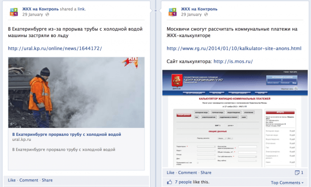 В сообществе также ежедневно публикуются новости и полезная информация, связанная с ЖКХ, — об изменении тарифов, авариях, их устранении и т.д.
