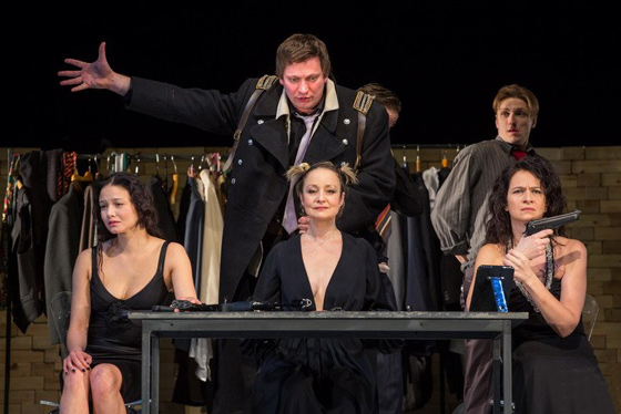 Дальше еще веселее: мужчины резво бегают по кругу, стучат кирпичами и пускают дым, изображая поезд в Москву; Вершинин скачет, разбрызгивая шампанское из бутылки, вместо макбетовых покрышек на сцену щедро падают ковры (в один из них в итоге кавказской пленницей закатают Машу), лопаются разноцветные шарики, Ирина (Лаура Пицхелаури) в затяжном припадке трясется от ненависти к телеграфу, Тузенбах (Григорий Чабан) ловко прикручивает себя к фитболу (а шарик вернулся, а он голубой), Маша является в белой пачке и черной фуражке — Кулыгин дает ей пощечину, и та кувыркается вверх тормашками… Сценка «Письмо для Александра Игнатьевича» разыгрывается неоднократно, всякий раз с разными клоунскими ужимками. Соленый то извивается и приплясывает Дракулой, то нахально жрет конфеты, читая уморительную открытку с тузенбаховым признанием в любви к Ирине (первая из двух решенных в спектакле сцен). Не расходитесь, господа, не расходитесь! Ряженых, конечно же, не будет, зато Чебутыкин с Соленым устроят маленький рок-концерт, Ирина, вся эдак изгибаясь, исполнит проникновенный номер Клавдии Шульженко «Руки» (как тут не вспомнить озорство Товстоногова на эту тему: «Уши, вы словно две большие птицы!»), а Вершинин с Кулыгиным премило изобразят лошадь (с обманутым Кулыгиным в виде крупа). Право слово, ряженые — это уже лишнее.