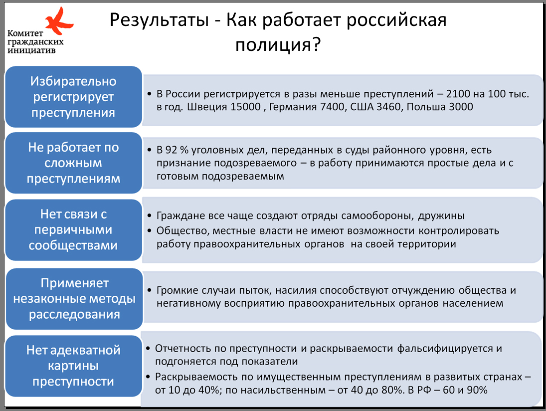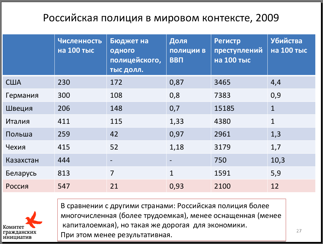 В сравнении с другими странами российская полиция более многочисленная и трудоемкая, менее оснащенная (менее капиталоемкая), но такая же дорогая для экономики. При этом менее результативная. У нас очень низкая регистрация, но при этом у нас очень много убийств.