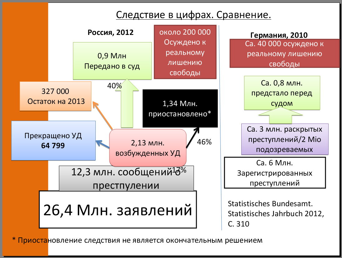 Эта существенная разница показывает нам, где происходит отсев либо тех людей, которые (может быть) совершили преступление, либо фактов совершения преступления. В Германии это происходит после регистрации преступления, при появлении подозрения по отношению к человеку. У нас это происходит где-то до этого.
