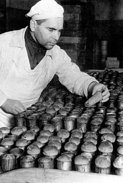 Подпись в нашем архиве такая: "Лучший сменный мастер "энской" кондитерской фабрики В. А. Абакумов, руководитель бригады, регулярно перевыполняющей норму. На снимке: В. А. Абакумов проверяет выпечку "венских пирожных". 12.12.1941 года. Ленинград. Фото А. А. Михайлов. ТАСС".