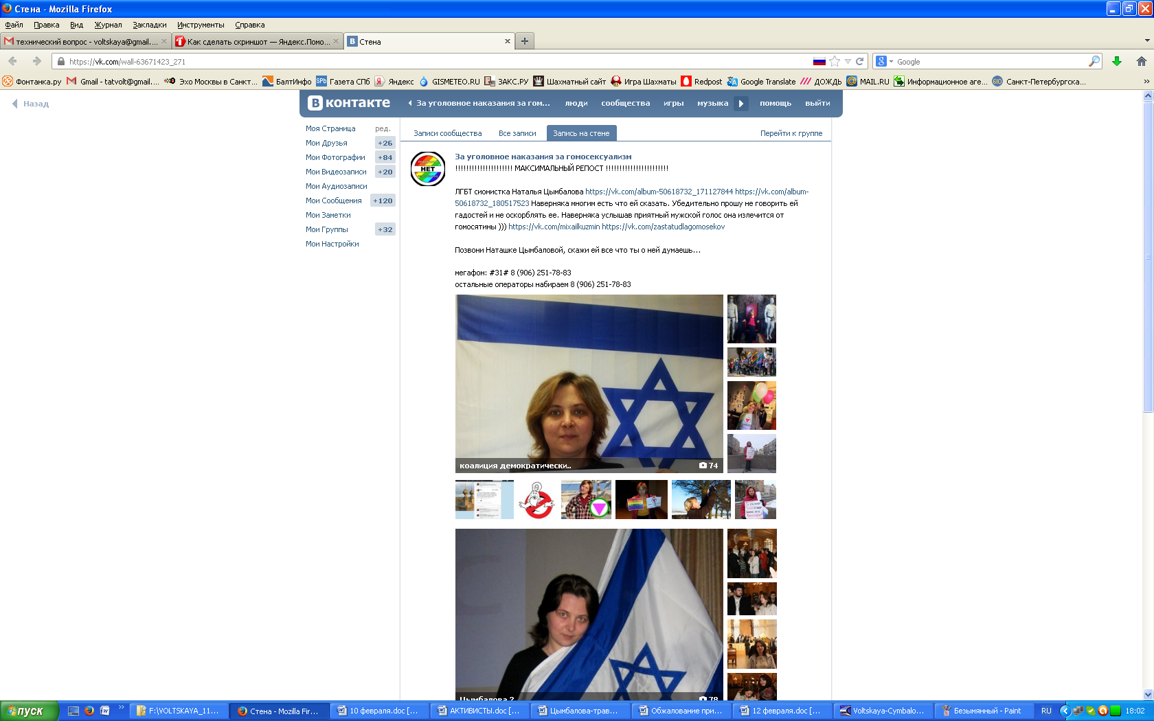 "Исаев и Кузьмин разместили у себя на страницах и в группах "ВКонтакте" мой телефон с призывом мне звонить, – говорит Наталья Цымбалова. – И вот уже два дня продолжаются звонки с угрозами, непристойные смс. Два дня назад я нашла еще у одного человека страничку "ВКонтакте", где он обещает устроить мне душ из кислоты. Они постоянно собирают досье, фотографии – не только на ЛГБТ-активистов, а на разных политических активистов, в основном, на евреев или тех, кого они считают евреями. Тимур Исаев давно занимается травлей членов нашего сообщества, он имеет отношение к запугиванию учительницы гимназии Кати Богач и еще одной учительницы из Магнитогорска Оли Бахаевой".