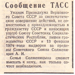 12 февраля Александр Исаевич был арестован, доставлен в Лефортовскую тюрьму КГБ и обвинен в измене Родине. Там же ему зачитали указ о лишении советского гражданства. 13 февраля он был выслан на самолете из СССР в ФРГ.