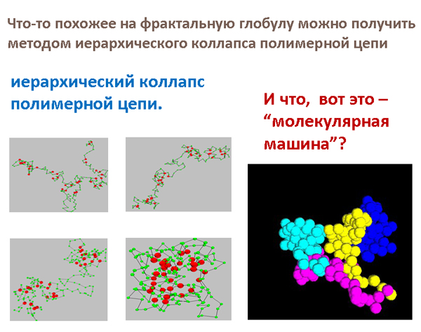 Для начала, можно придумать физическую модель такого процесса – мы такой процесс назвали иерархическим коллапсом полимерной цепи - когда звенья сначала укладываются в маленькие кластеры, из которых образуются кластеры побольше, из которых образуются еще бо'льшие кластеры – и, наконец, самый большой кластер. При этом, что очень важно, сами кластеры не сливаются, а представляют собой целостные структурные субъединицы.