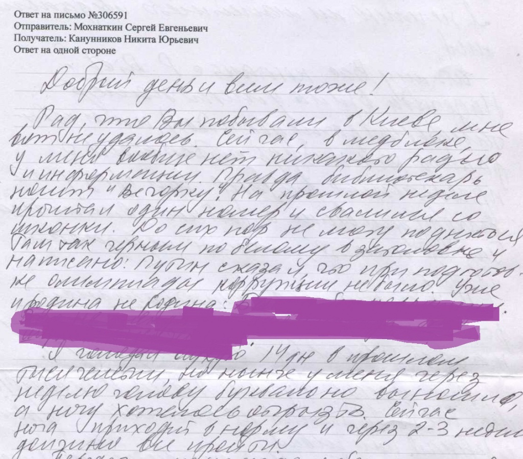 Письмо в СИЗО «Бутырка» было отправлено через «ФСИН-письмо» — услугу, которая позволяет заключенным получать послания по электронной почте через цензора. Это письмо, как и десятки других, не было вручено адресату. Почти через месяц друг Николая Кавказского получил ответ из «Бутырки»: «Письмо № 210882 не прошло цензуру».