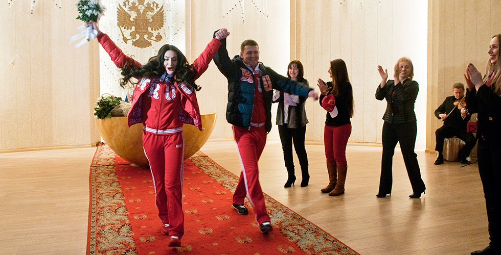 В день открытия Олимпиады в зал торжественных бракосочетаний города-курорта Сочи вошли жених и невеста в идентичных красных костюмах от Bosco. Вместо фаты невеста имела на голове красную кепку. Обуты они были так: невеста — в красные кроссовки, жених — в черные. За ними тянулся шлейф гостей и журналистов.