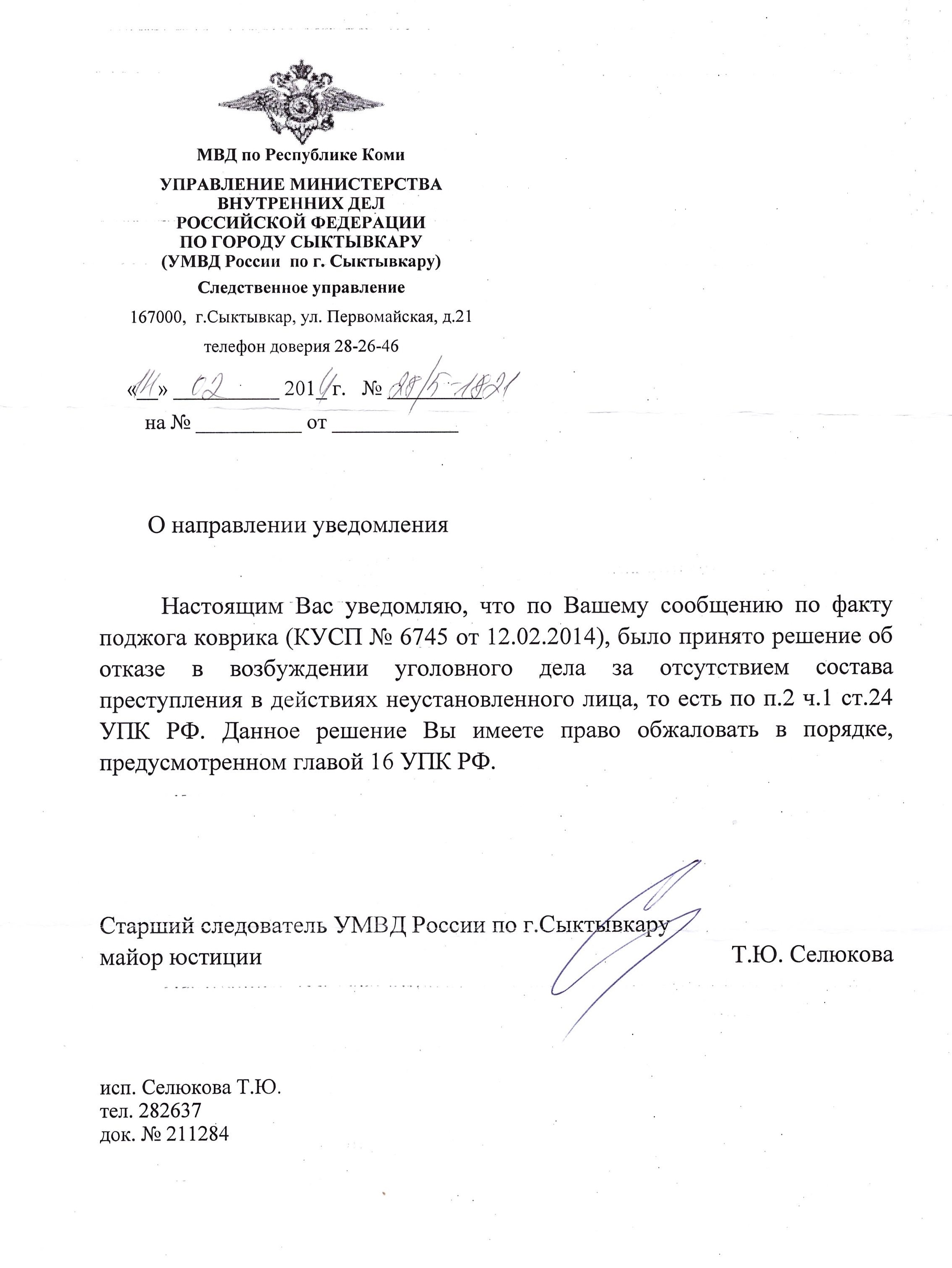 Как сообщили «7х7» в пресс-службе МВД по Коми, полиция не стала возбуждать уголовное дело по факту поджога коврика у дверей квартиры правозащитника, так как материальный ущерб, по мнению правоохранителей, не нанесен. Вместе с тем сотрудники правопорядка продолжают искать злоумышленника и обещают привлечь его к ответственности.