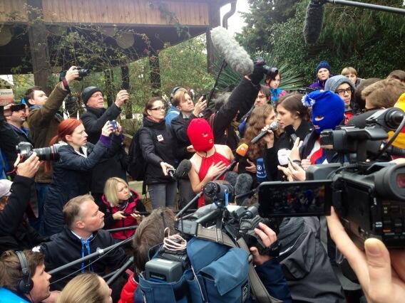 Пресса была в основном представлена иностранными журналистами, сообщил с места событий корреспондент The New Times. В 10:15 приехали сами участницы группы Pussy Riot. В это же время появились молодые парни-провокаторы, которые держали в руках тушки куриц, а один из них сам был одет в костюм петуха. Они скандировали: «We like sex with chicken» («Нам нравится секс с курицами») и пытались помешать активисткам пройти к журналистам.