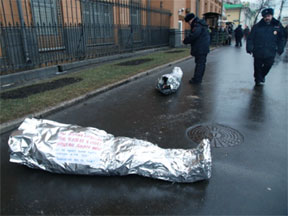 Фото: «Защитники Ярошенко» На "телах" было написано на русском и английском языках: «Мы против нарушений прав человека в США! Ярошенко должен жить!».