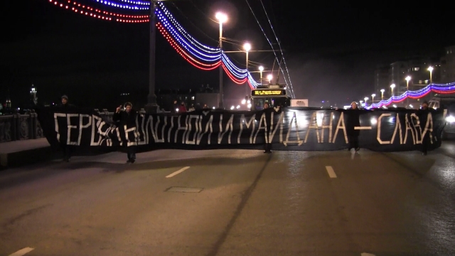 В Москве на Большом Каменном мосту задержаны пятеро активистов, перекрывших движение с баннером "Героям Болотной и Майдана - слава". Среди них одна женщина. Вместе с активистами были задержаны корреспондент "Граней" Андрей Новичков и сотрудники издания Каспаров.Ру Алексей Бачинский и Евгений Ухмылин. Журналистов вскоре отпустили.