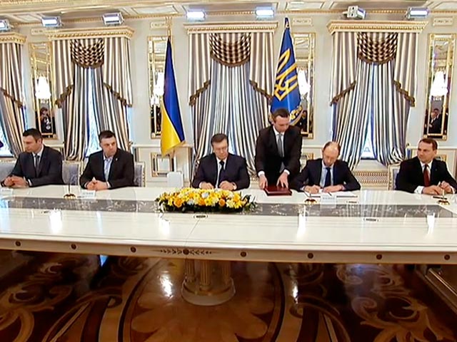 Соглашение об урегулировании кризиса подписали президент Украины Виктор Янукович и лидеры трех оппозиционных фракций Рады: Виталий Кличко, Арсений Яценюк и Олег Тягнибок. Также соглашение засвидетельствовали представители ЕС: глава МИД Польши Радослав Сикорский и Германии Франк-Вальтер Штайнмайер, а также глава департамента континентальной Европы МИД Франции Эрик Фурнье, уточняет "Интерфакс".