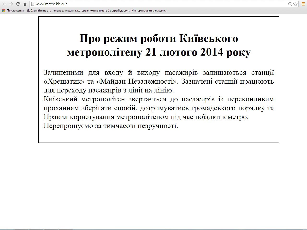 Киевский метрополитен частично возобновил свою работу накануне, после того как мэр Киева вышел из рядов поддерживающей президента Виктора Януковича Партии регионов и дал распоряжение возобновить работу метро. Метрополитен был закрыт властями 18 февраля.