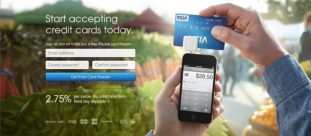 В данном примере сайт Square использует большое фоновое изображение, для того чтобы рассказать о своем продукте: устройство «square reader» позволяет принимать кредитные карты где угодно. Размытое изображение показывает использование устройства на ярмарке, объясняя при этом, как оно работает. Подобное изображение является одним из самых быстрых и простых способов рассказать посетителям сайта о том, что такое Square.