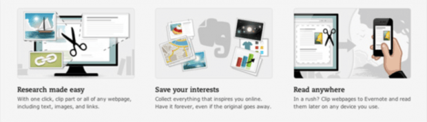 С помощью детальных изображений Evernote рассказывает о том, как работает их продукт. Порядок организации блоков иллюстраций и текста задает правильный порядок их прочтения − слева направо. Вместе друг с другом изображения и текст объясняют то, как устроен Evernote: с помощью приложения можно собирать различный контент из Интернета и иметь к нему доступ с любого устройства.