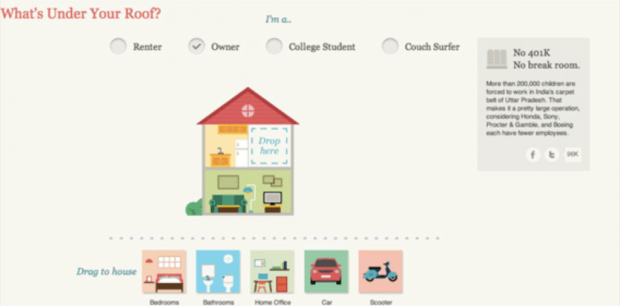 На сайте Slavery Footprint вы можете узнать о том, как много рабов трудятся для вас. Интерактивное исследование рассказывает историю рабства и о том, как ваш собственный образ жизни влияет на рабство. Информация, которую вы предоставляете, делает вас частью истории, а интерактивный подход служит хорошим способом привлечь внимание к этой непростой теме.