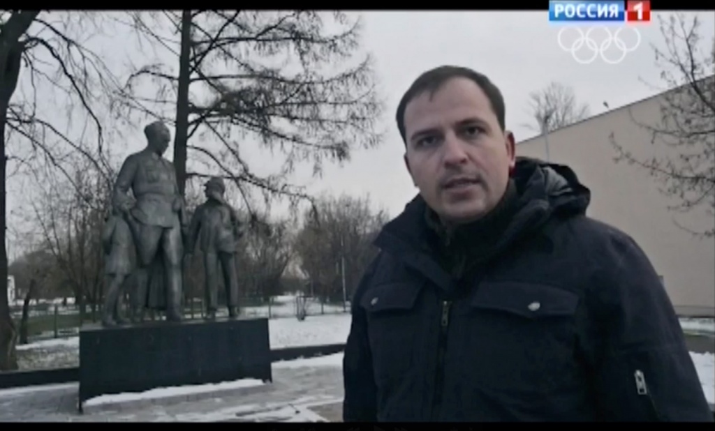 а тележурналист Константин Семин (справа) вещает на фоне патриотического памятника Увы и ах… Первая пятидневка сочинских ристалищ нашим олимпийцам как-то не задалась — две золотые медали, обе за фигурное катание, и одна за другой катастрофы как у стреляющих, так и у безоружных лыжников. Экватор Игр наша команда пересекла, занимая седьмую строчку в общекомандном зачете. Именитый олимпиец Александр Карелин, которому все понравилось в Сочи, смущенно посетовал на камеру одного из государственных телеканалов: «Звона медалей не слышно». А комментатор НТВ+ Иоланта Чен в те дни чуть не плакала: «Ну, когда же наши хоть что-нибудь завоюют…» Перед забегом на полторы тысячи метров досадовал другой комментатор: «Неужели пьедестал опять будет голландским?» Ему — соведущая: «Ваня покажет бег». Ваня Скобрев не показал. Пессимистические настроения по части неуспехов спортсменов усугублялись прорывавшимися жалобами на незимнюю погоду, на высокую температуру в горах, на качество лыжных трасс как в горах, так и на равнине. «Ой, все больше луж, — удивляется комментатор. И тут же спохватывается: — Но скольжение хорошее». Другой: «На снежных участках — вода, но… трасса совершенно очевидно в хорошем состоянии». Горнолыжные трассы в таком хорошем состоянии, что лучшие из лучших не доезжают до финиша, а побеждают самые осторожные. Кто не унывал, так это Дмитрий Губерниев. Он, в принципе, человек необузданного оптимизма. Наши лыжницы безнадежно провалились. Секундная пауза разочарования. И тут же: «Что творит Шарлота Калла! Какой финиш… Ярчайший! Умопомрачительный! Вот это уровень!» И без перехода: «Наш удел — шестое место». «Удел» наших биатлонисток был еще скромнее, но восторгам Губерниева в отношении белорусской соперницы Дарьи Домрачевой не было предела. Это не от недостатка патриотизма комментатора. Любовь Дмитрия к Родине вне подозрений. Когда наши побеждают, его словесный селевой поток становится абсолютно неудержимым. Просто он человек азартный. Скажу больше: он — само воплощение азарта. Азарт у него первичен, а все остальное вторично. В том числе и гордость за страну. И это спасает его от патриотической односторонности, замешанной на геополитических амбициях, столь свойственных телевизионным оракулам с государственных каналов. Занятно было наблюдать, как они старались утешить отечественных болельщиков. Шайба раздора Поражение российских хоккеистов от американцев в групповом турнире больно задело геополитическое самолюбие и Сергея Брилева, и Дмитрия Киселева. Оба долго в своих информационно-аналитических программах разбирались с незасчитанной шайбой в ворота США. И вот им говорят Фетисов, Буре, Ларионов — звезды мирового хоккея: шайбу нельзя было засчитывать, если она залетела в сдвинутые ворота — таковы правила. Им вторят авторитетные судьи: «Правильно, что отменили гол». Но звезды нашей шоу-политики твердят: нет, неправильно. «Ааааа! — кричат они, — так еще и судья — американец! Тогда все понятно». А понятно им то, что это все происки заокеанских недругов РФ. Когда надежды на возгонку патриотических эмоций не оправдываются непосредственно на спортивных площадках, то отчего бы их не приподнять как-то иначе. „
