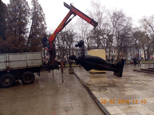 Кто принял решение о сносе памятника неясно. Издание lviv.at.ua называет это эпизодом борьбы с памятниками советской эпохи. Сообщения о сносе памятников Владимиру Ленину за последние дни поступили из десятков городов Украины. С поверженными памятниками обычно обращаются не так бережно: часто Ленина раскалывают на куски и растаскивают на сувениры.